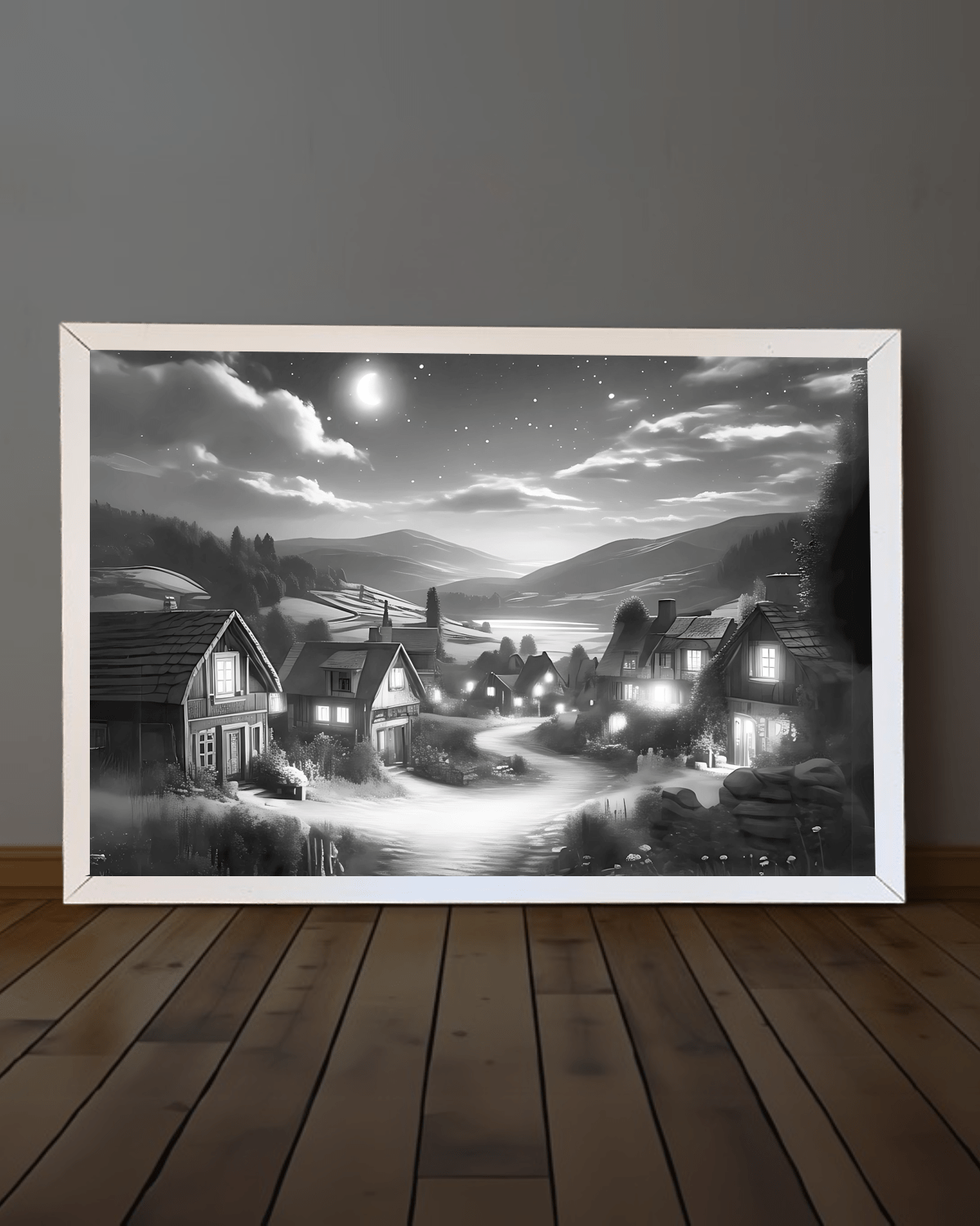 This glowing frame shows a peaceful village under the soft light of the moon. It brings calm and warmth to any space. A perfect frame for those who love village life and nature.